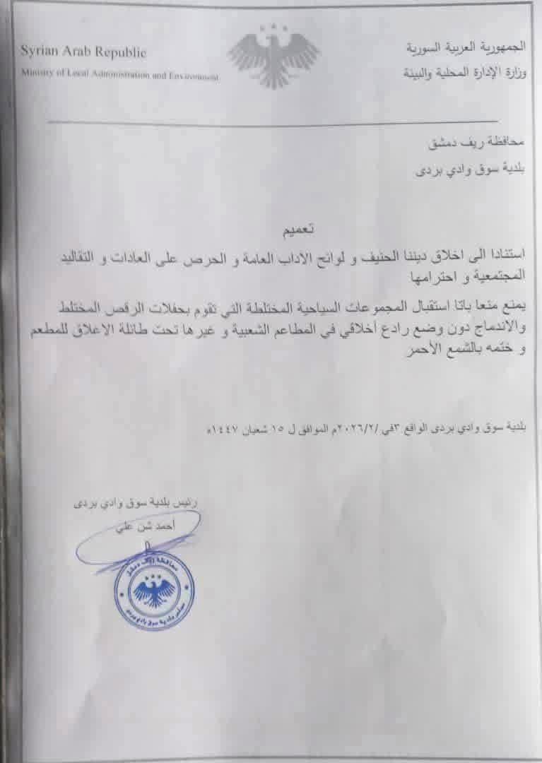أصدرت بلدية سوق وادي بردى في ريف دمشق، بتاريخ 3 شباط/فبراير 2026، تعميماً يقضي بمنع المطاعم في المنطقة من استقبال المجموعات السياحية التي تمارس الاحتفال أو الرقص المختلط بين النساء والرجال، بحجة مخالفة ما وصفه القرار بـ«العادات والتقاليد».