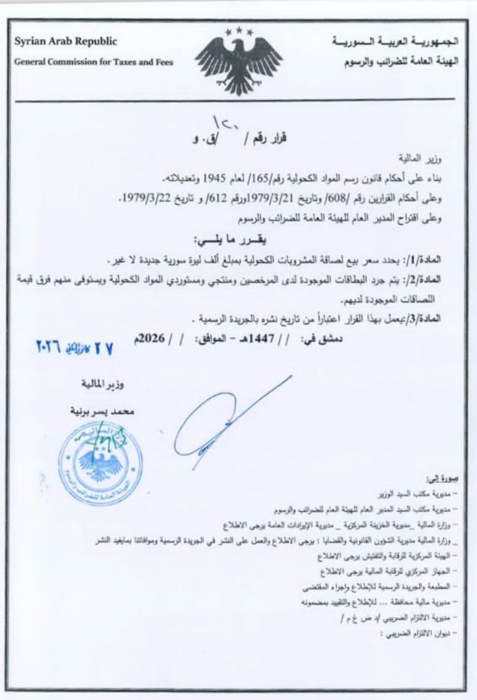 أصدرت وزارة المالية في السلطة السورية المؤقتة القرار رقم 120 بتاريخ 27 كانون الثاني/يناير 2026، والذي نص في مادته الأولى على تحديد سعر بيع لصاقة المشروبات الكحولية بمبلغ 1000 ليرة سورية وفق العملة الجديدة.