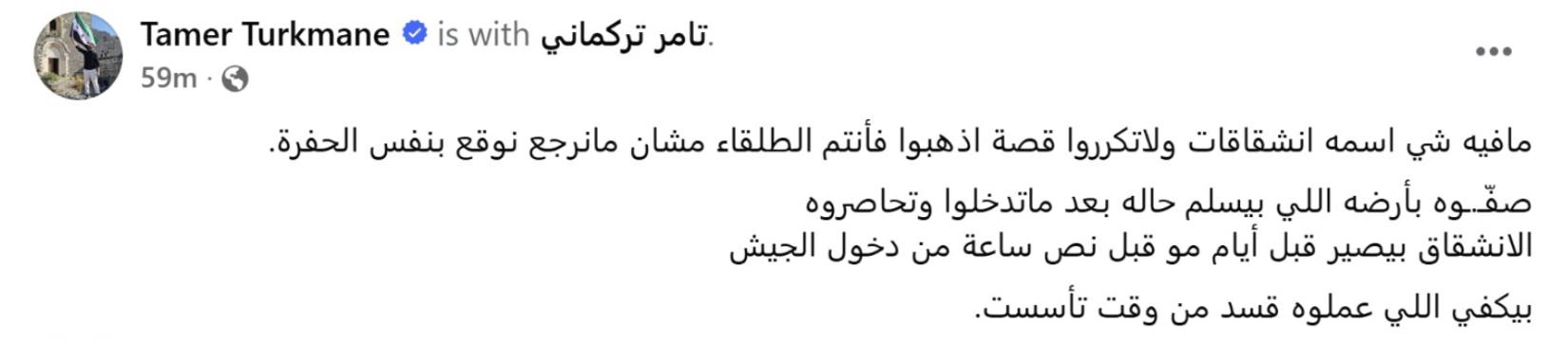 ووثّقت المنصة منشوراً نشره تامر تركماني، الذي يعرّف عن نفسه بصفته مؤسس “أرشيف الثورة السورية”، على صفحته في موقع فيسبوك، دعا فيه إلى قتل مقاتلين كرد من قوات سوريا الديمقراطية (قسد) أثناء قيامهم بتسليم أنفسهم. وقد أقدم لاحقاً على حذف المنشور، دون أن ينفي مضمونه.