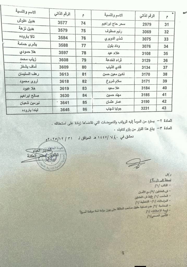 أُفيد بتاريخ 3 كانون الثاني/يناير 2026 بصدور قرارات إدارية من قبل السلطات المؤقتة في سوريا شملت فصل موظفين ونقل كادر تعليمي في عدة مؤسسات ومناطق سورية، أبرزها العاصمة دمشق ومحافظتا طرطوس وحمص، وذلك في سياق أوسع من إجراءات مشابهة شهدتها البلاد خلال الأشهر السابقة.