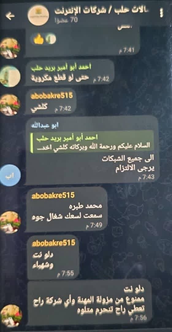 كما أكدت المصادر قطع خدمة الإنترنت والاتصالات عن الحيين. ووفق محادثات ضمن مجموعة “واتس آب” حكومية خاصة بتاريخ 22 كانون الأول/ديسمبر 2025، حصلت عليها “رايتس ومونيتور سوريا”، وتضم مسؤولين عن الاتصالات في مدينة حلب، جرى التأكيد على إجبار أصحاب توزيع خدمات الإنترنت الخاصة على قطع الإنترنت، مع التهديد بفرض عقوبات بحق المخالفين.