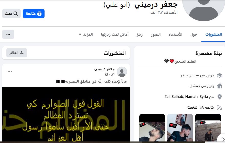 Note: The armed men who killed the young man Jaafar Drmeini posted a video on his Facebook page accompanied by the chant “Saleel Al-Sawarim”, which is an anthem used by extremist jihadist organizations and commonly circulated among members of Hay’at Tahrir al-Sham.