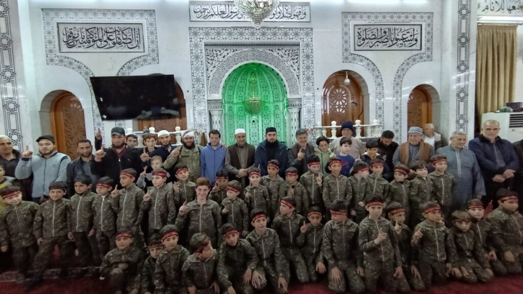 On March 16, 2026, the “Al-Qadam Grand Mosque” in the Syrian capital, Damascus, published on its official Facebook page images of children appearing dressed in military attire and wearing red headbands, in a simulation resembling members of “Hay’at Tahrir al-Sham,” known as the “Red Headbands.”