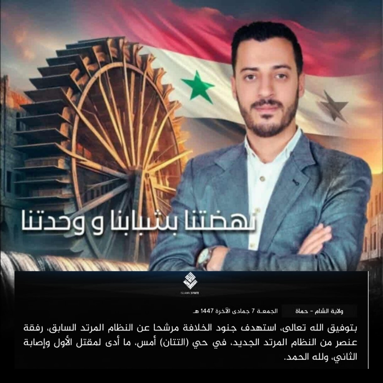 Accounts loyal to the interim authority “Hay’at Tahrir al-Sham” published on the X platform a statement by the Islamic State organization “ISIS” claiming responsibility for the killing of the citizen Maher Kazkaz and the young man Hudhayfa Tuti, who is from the Shiite sect and was killed in an armed attack on 27 November 2025 while he was working at his stall selling fava beans, which he had built from stones on the outskirts of the village of al-Mazra‘a in the Homs countryside in central Syria.