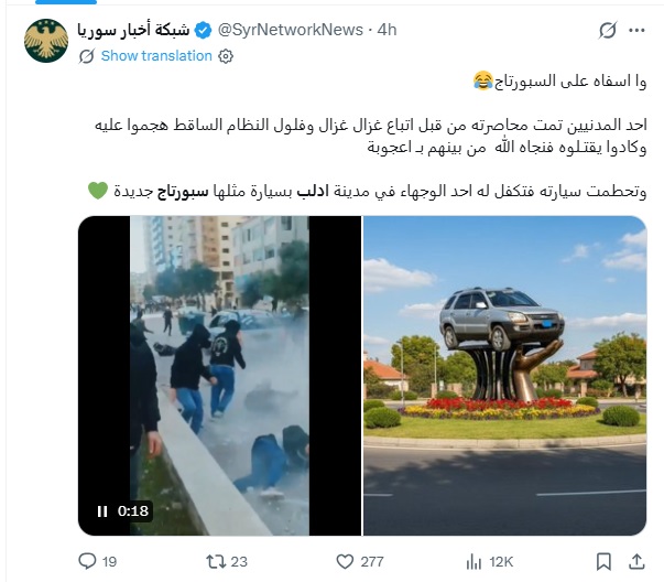In the same context, content circulated on social media platforms published by supporters of the interim authority included images of a car used to run over demonstrators from the Alawite sect, accompanied by sarcastic comments of a sectarian nature that glorified the incident and mocked the victims. Accounts on the “X” platform also circulated information stating that one of the notables in the city of Idlib undertook to provide a new “Sportage” vehicle to the perpetrator of the ramming incident, in a context that shows normalization with violence and incitement to it.