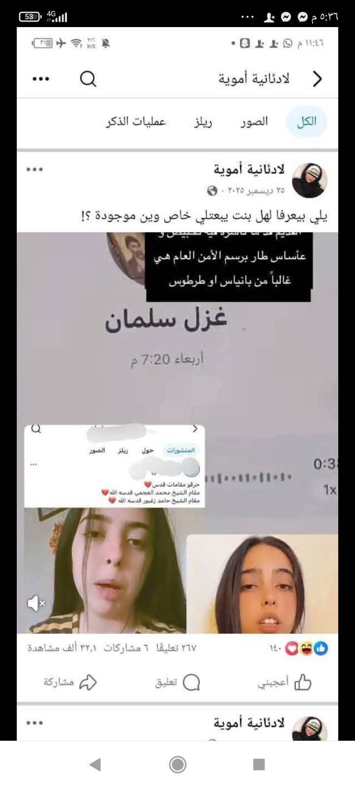 According to available information, Ghazal Abdo Salman is enrolled in the Faculty of Agricultural Engineering at Latakia University (formerly known as Tishreen University). She was summoned for questioning after publishing content on her personal accounts addressing the March events, which she described as massacres targeting Alawites.