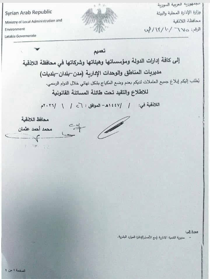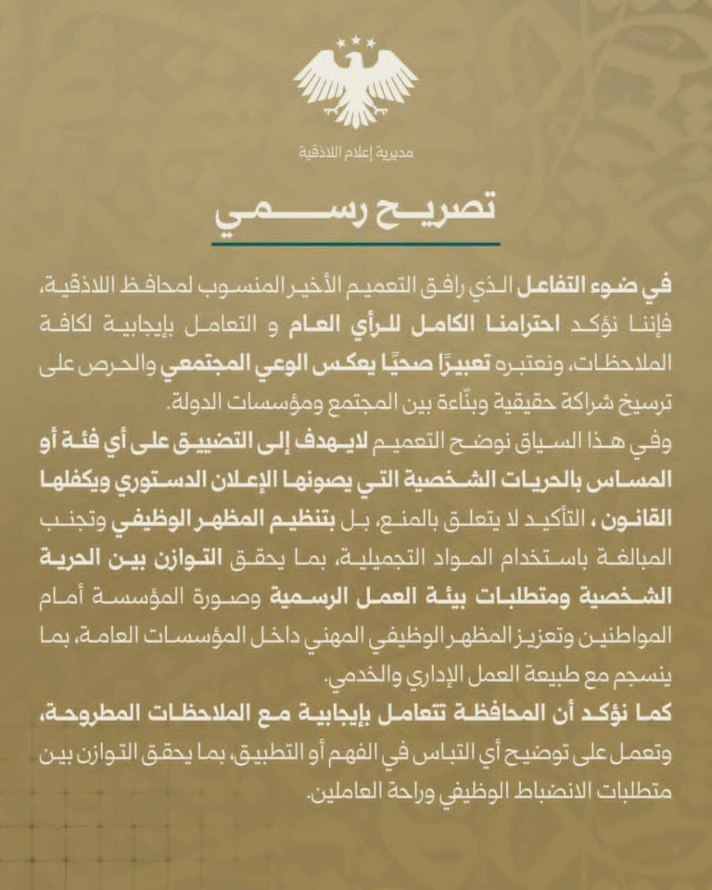 On 26 January 2026, an administrative circular was issued by the Governor of Latakia, Mohammad Ahmad Othman, appointed by the Interim Authority, mandating a complete ban on female employees in public departments and institutions from wearing makeup during official working hours.